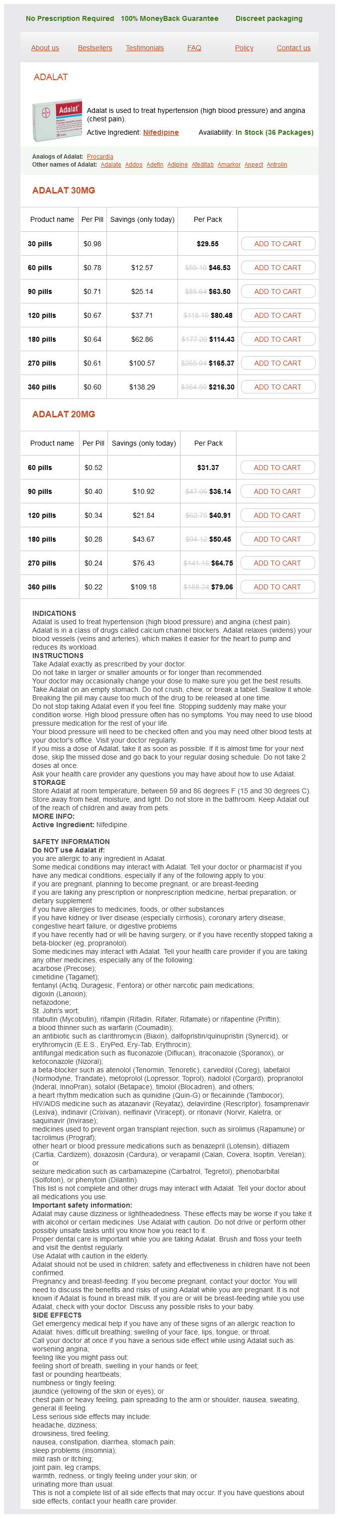 Adalat packs: 30 pills, 60 pills, 90 pills, 120 pills, 180 pills, 270 pills, 360 pills