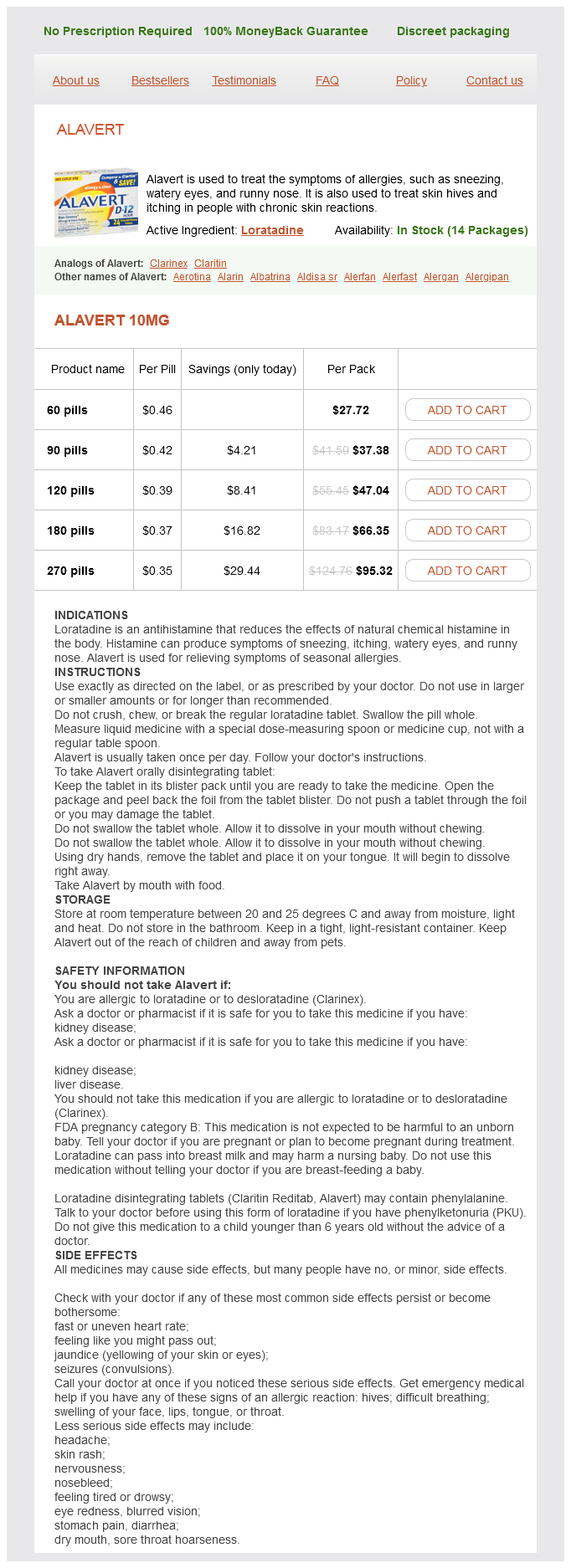 Alavert packs: 60 pills, 90 pills, 120 pills, 180 pills, 270 pills