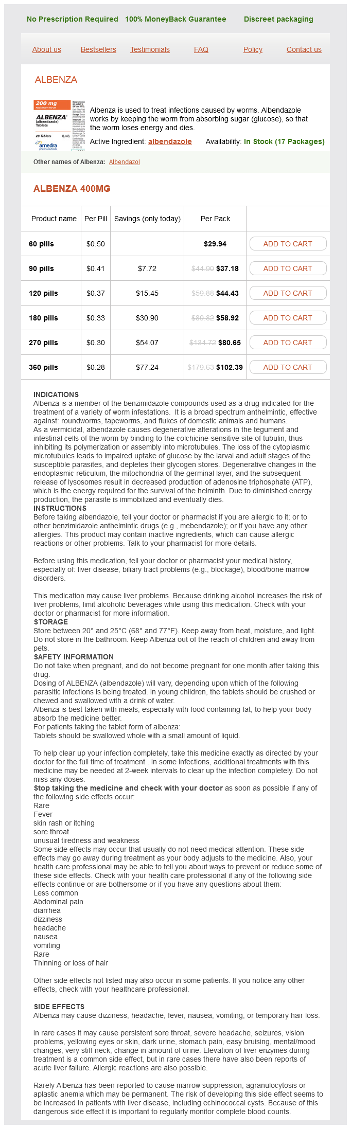 Albenza packs: 60 pills, 90 pills, 120 pills, 180 pills, 270 pills, 360 pills