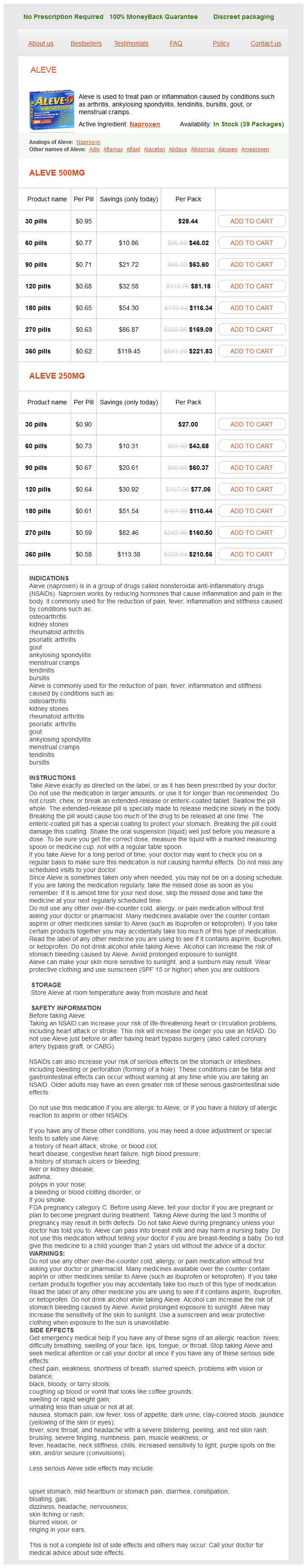 Aleve packs: 30 pills, 60 pills, 90 pills, 120 pills, 180 pills, 270 pills, 360 pills