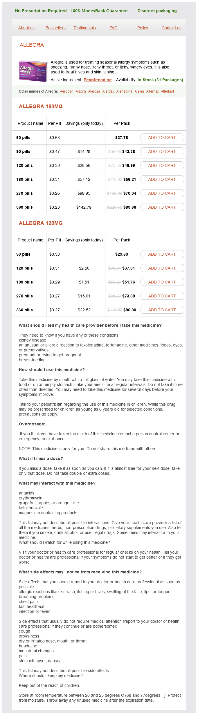 Allegra packs: 60 pills, 90 pills, 120 pills, 180 pills, 270 pills, 360 pills