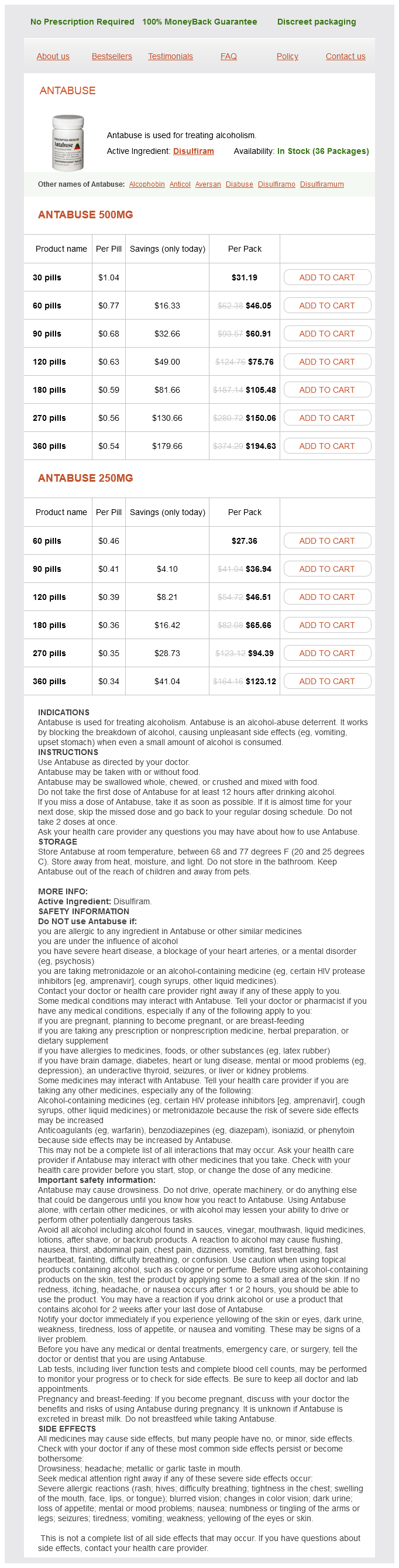 Antabuse packs: 30 pills, 60 pills, 90 pills, 120 pills, 180 pills, 270 pills, 360 pills