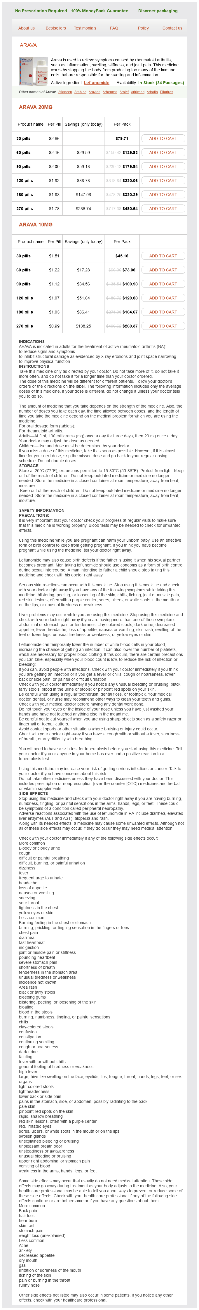 Arava packs: 30 pills, 60 pills, 90 pills, 120 pills, 180 pills, 270 pills