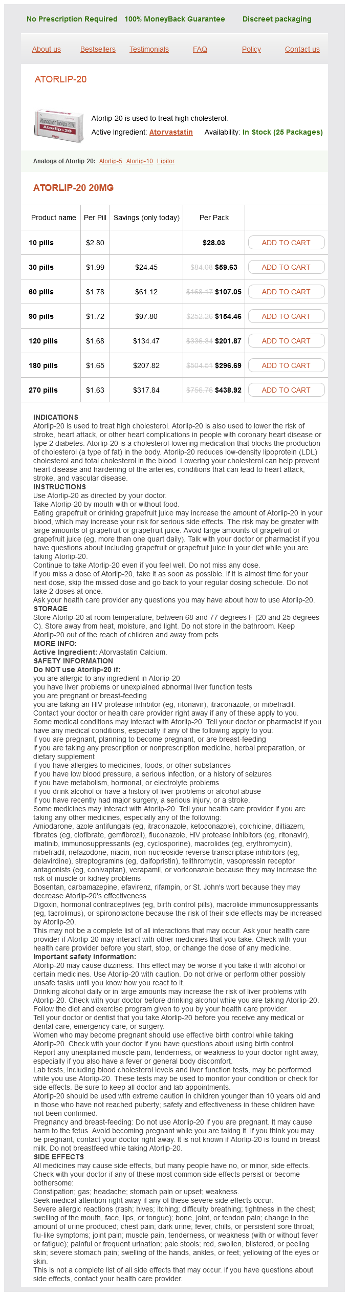 Atorlip-20 packs: 10 pills, 30 pills, 60 pills, 90 pills, 120 pills, 180 pills, 270 pills