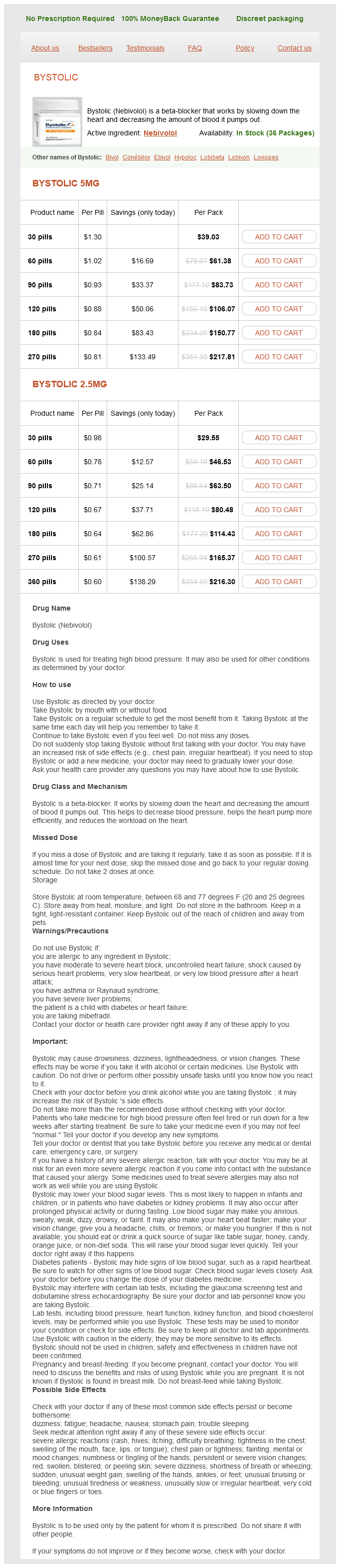 Bystolic packs: 30 pills, 60 pills, 90 pills, 120 pills, 180 pills, 270 pills, 360 pills
