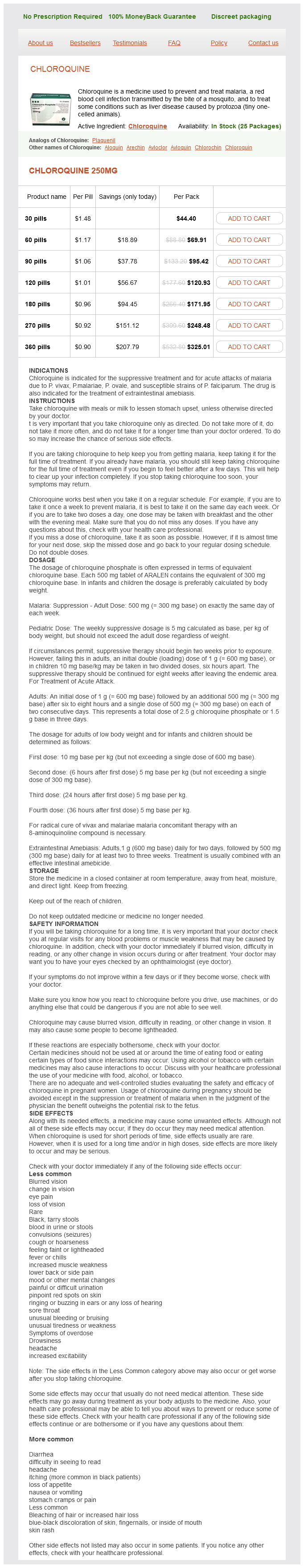 Chloroquine packs: 30 pills, 60 pills, 90 pills, 120 pills, 180 pills, 270 pills, 360 pills