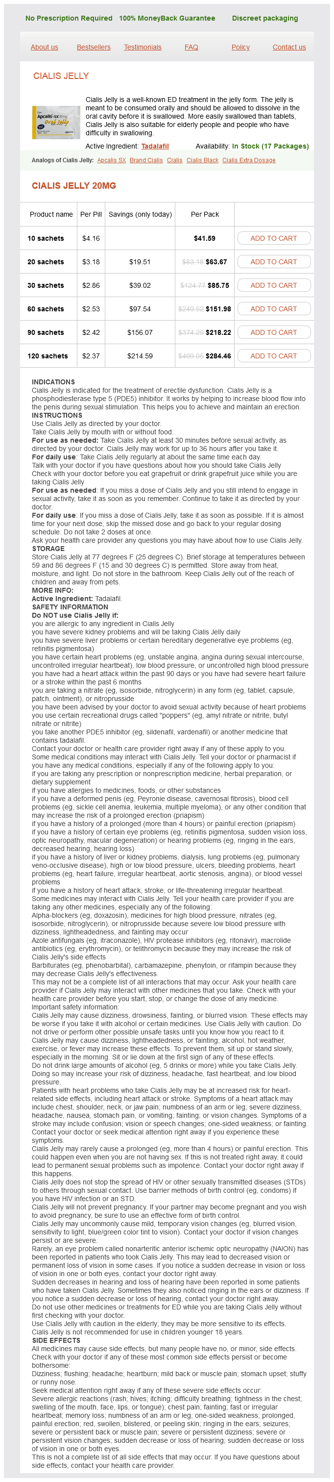 Cialis Jelly packs: 10 sachets, 20 sachets, 30 sachets, 60 sachets, 90 sachets, 120 sachets