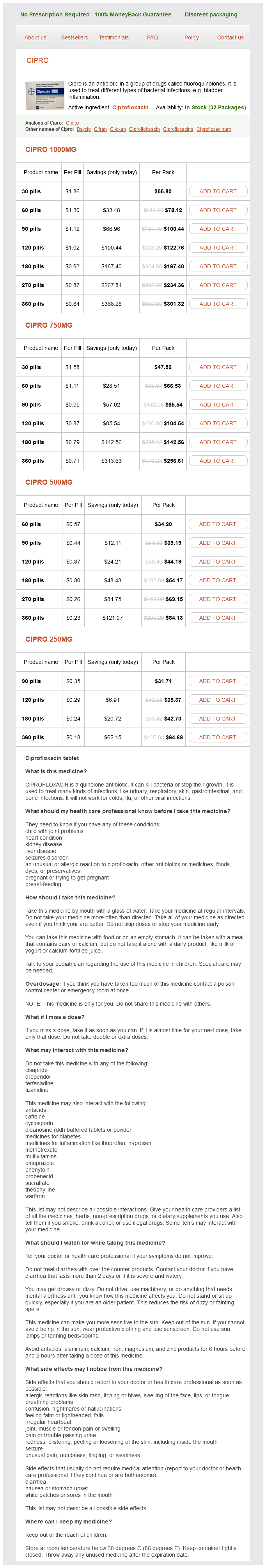 Ciprofloxacin packs: 30 pills, 60 pills, 90 pills, 120 pills, 180 pills, 270 pills, 360 pills