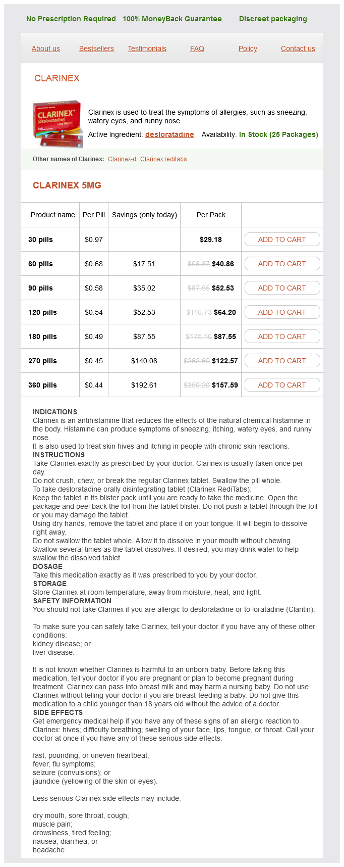 Flare was defined as the reappearance of pruritus and/or visible psoriasis areas as initially evaluated allergy symptoms drowsiness clarinex 5 mg purchase without prescription. No serious adverse events were recorded, other than mild transient stinging was reported by one patient at the onset of treatment. Mimyx Cream is contraindicated in patients with known hypersensitivity to any of the components of the formulation. Mimyx Cream does not contain a sunscreen and should not be used prior to extended exposure to the sun if being utilized for non-intertriginous psoriasis. Medical practitioners need to have the ability to utilize medications for psoriasis in intertriginous areas that are safe and effective as well as provide an improvement in the quality of life. As discovered in our small case series, the key goal of providing an adjunctive therapeutic modality in the prevention of inverse psoriasis flare frequency was achieved. Randomized, blinded studies with a larger sample size are needed to further corroborate our data. The impact of psoriasis on quality of life: results of a 1998 National Psoriasis Foundation patient-membership survey. Abstract submitted for presentation at: 64th Annual Meeting of the American Academy of Dermatology; March 2006; San Francisco, Ca Kemeny, Abstract submitted for presentation at 64th Annual Meeting of the American Academy of Dermatology; March 2006; San Francisico, Ca Jorizzo, Poster presented at: 63rd Annual Meetin of the American Academy of Dermatology; February 18-22, 2005; New Orleans, La. Submitted for presentation at: 64th Annual Meeting of the American Academy of Dermatology; March 2006; San Francisico,Ca. Submitted for presentation at; 64th Annual Meeting if the American Academy of Dermatology; March 2006;San Francisco, Ca. The disease produces skin and connective-tissue fibrosis, leading to nephrogenic systemic fibrosis and eventually death. The intent of this case study is to provide education about this disease and its association with gadolinium contrast, and stress that its prevention is of paramount importance in order to avoid increasing the number of cases of this disease around the world. The skin lesions can progress rapidly, sometimes leading to joint contractures and immobility. It is estimated that 65% to 78% of gadolinium contrast can be renally cleared after one session of hemodialysis and 98% cleared after three sessions. Peritoneal dialysis, on the other hand, may be less effective in the clearance of gadolinium contrast compared to hemodialysis. Louis study in 2001, it took 22 days for patients undergoing continuous peritoneal dialysis to excrete only 69% of the gadolinium contrast. Such slow clearance of the gadolinium contrast media leads to prolonged exposure to the heavy metal gadolinium among peritoneal dialysis patients. If gadolinium contrast is necessary, and if patients have an established access for hemodialysis, immediate hemodialysis should be given after contrast administration to facilitate renal clearance of the contrast. Case Presentation A 62-year-old Caucasian male on hemodialysis for chronic renal failure secondary to type 2 diabetes mellitus presented with progressive skin lesions. They were consistent with thickening and hardening of the skin and appeared on his lower and upper extremities as well as his upper body, with minimal truncal involvement. The patient complained of pain with occasional mild pruritus and a burning sensation.
