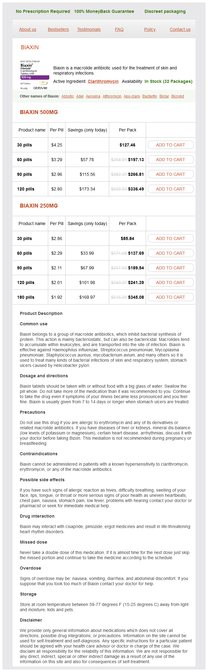Clarithromycin packs: 30 pills, 60 pills, 90 pills, 120 pills, 180 pills