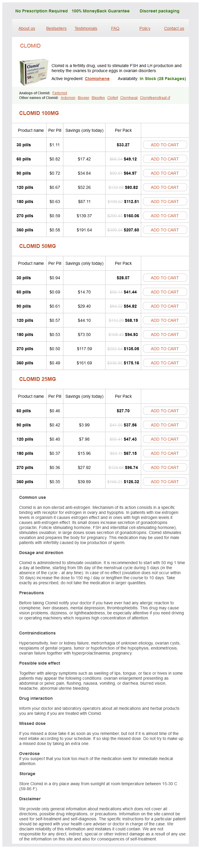 Clomid packs: 30 pills, 60 pills, 90 pills, 120 pills, 180 pills, 270 pills, 360 pills