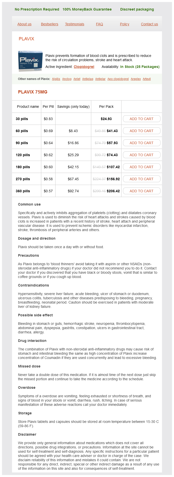 Clopidogrel packs: 30 pills, 60 pills, 90 pills, 120 pills, 180 pills, 270 pills, 360 pills