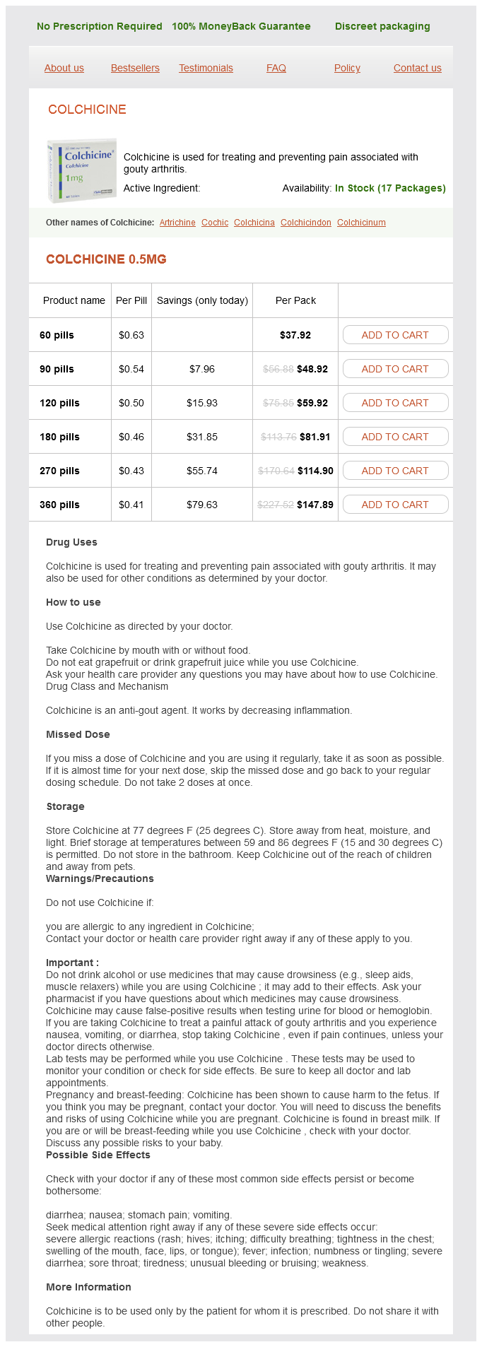 Colchicine packs: 60 pills, 90 pills, 120 pills, 180 pills, 270 pills, 360 pills