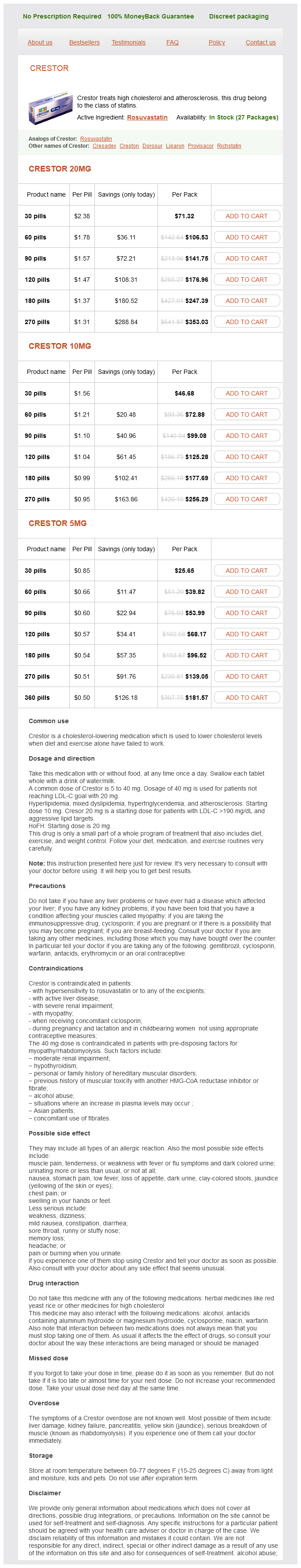 Crestor packs: 30 pills, 60 pills, 90 pills, 120 pills, 180 pills, 270 pills, 360 pills