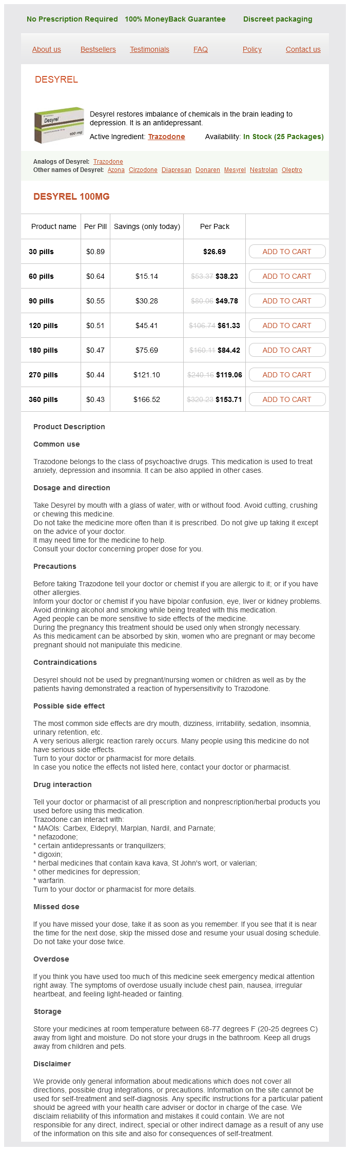 Desyrel packs: 30 pills, 60 pills, 90 pills, 120 pills, 180 pills, 270 pills, 360 pills