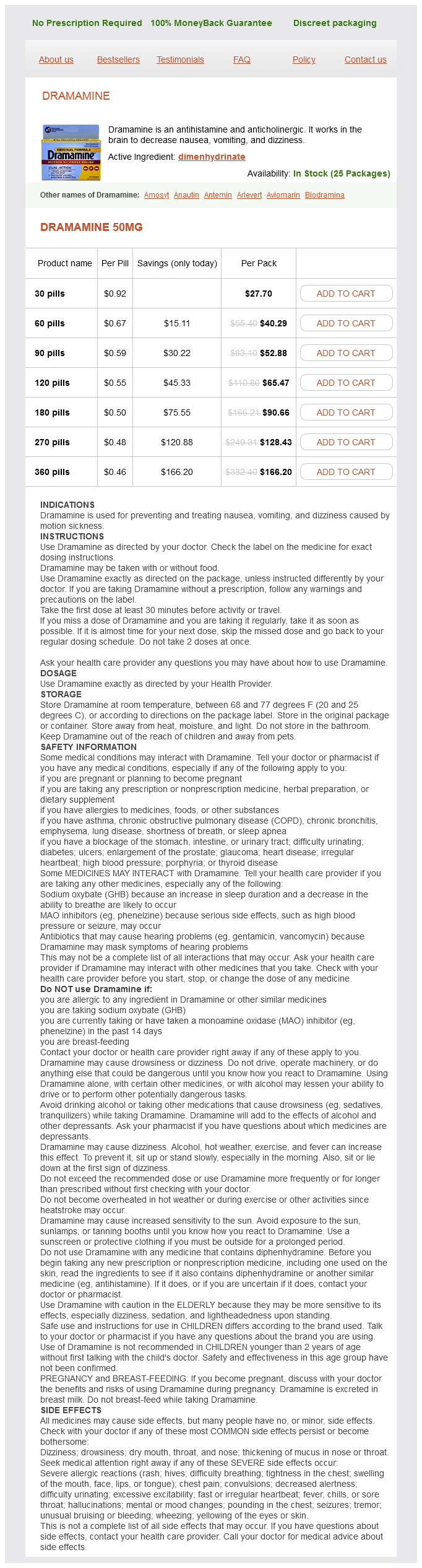 Dramamine packs: 30 pills, 60 pills, 90 pills, 120 pills, 180 pills, 270 pills, 360 pills