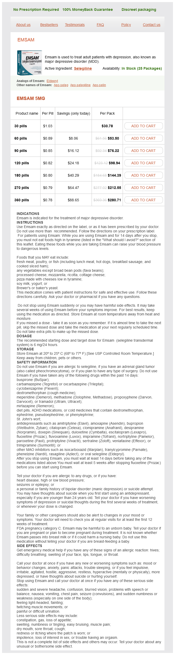 Emsam packs: 30 pills, 60 pills, 90 pills, 120 pills, 180 pills, 270 pills, 360 pills