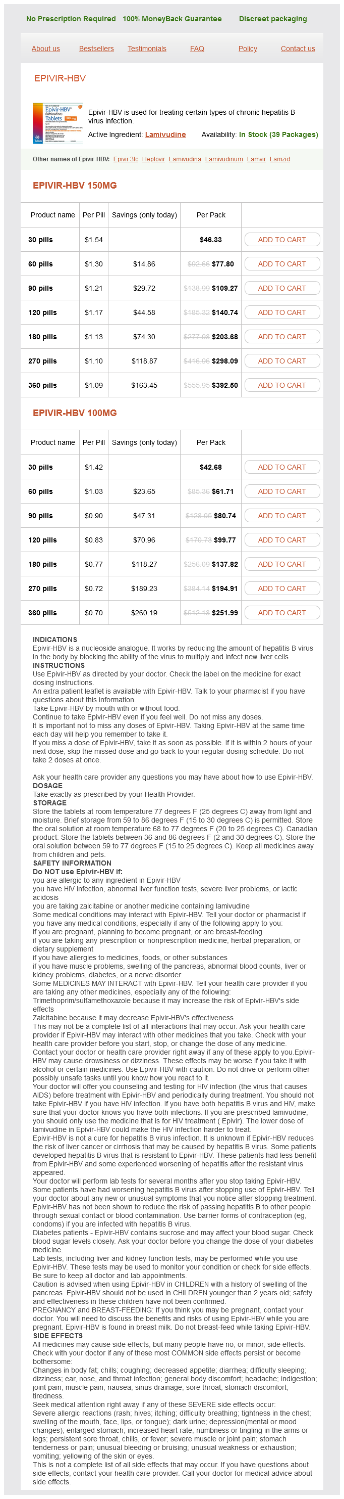 Epivir-HBV packs: 30 pills, 60 pills, 90 pills, 120 pills, 180 pills, 270 pills, 360 pills