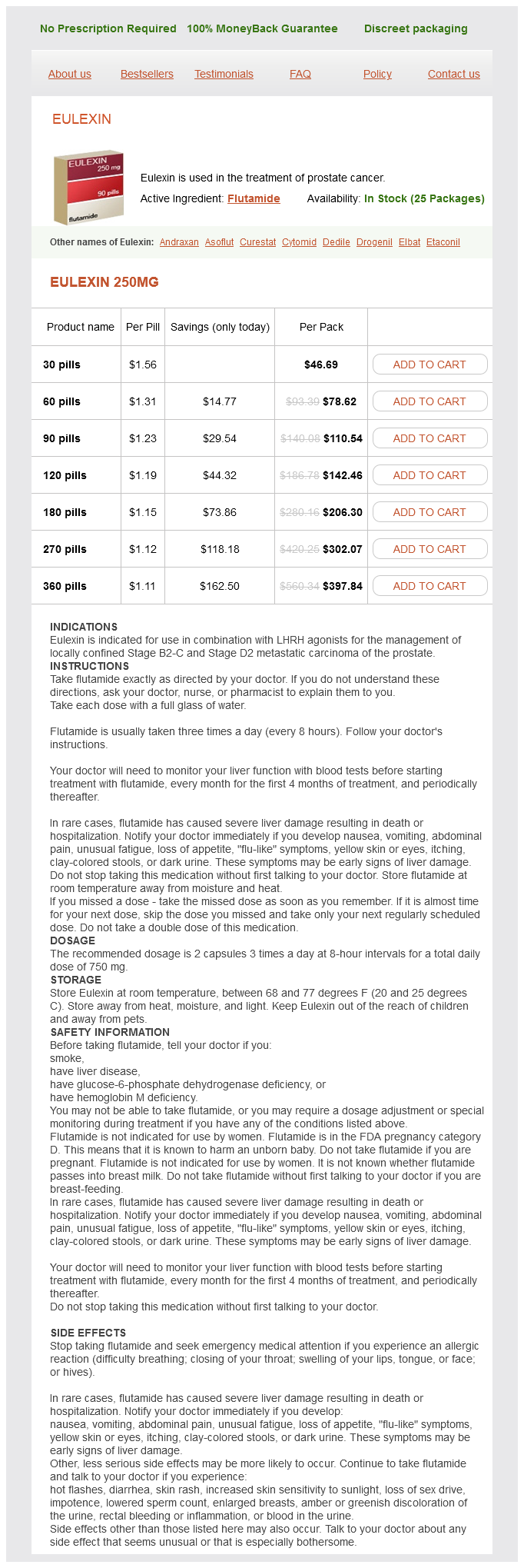 Eulexin packs: 30 pills, 60 pills, 90 pills, 120 pills, 180 pills, 270 pills, 360 pills