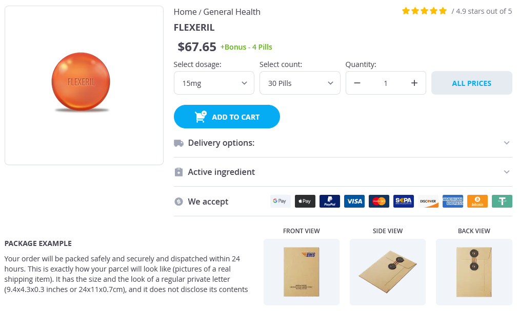 Flexeril packs: 30 pills, 60 pills, 90 pills, 120 pills, 180 pills, 240 pills, 360 pills