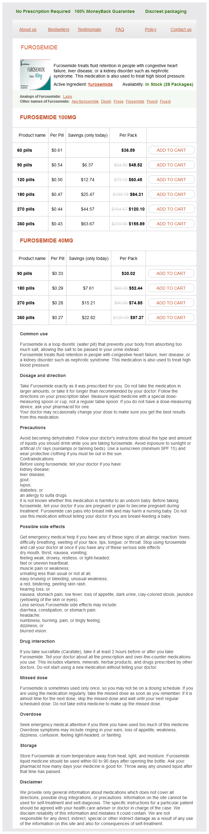 Furosemide packs: 60 pills, 90 pills, 120 pills, 180 pills, 270 pills, 360 pills