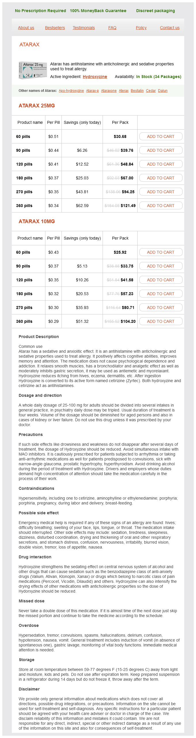 Hydroxyzine packs: 60 pills, 90 pills, 120 pills, 180 pills, 270 pills, 360 pills