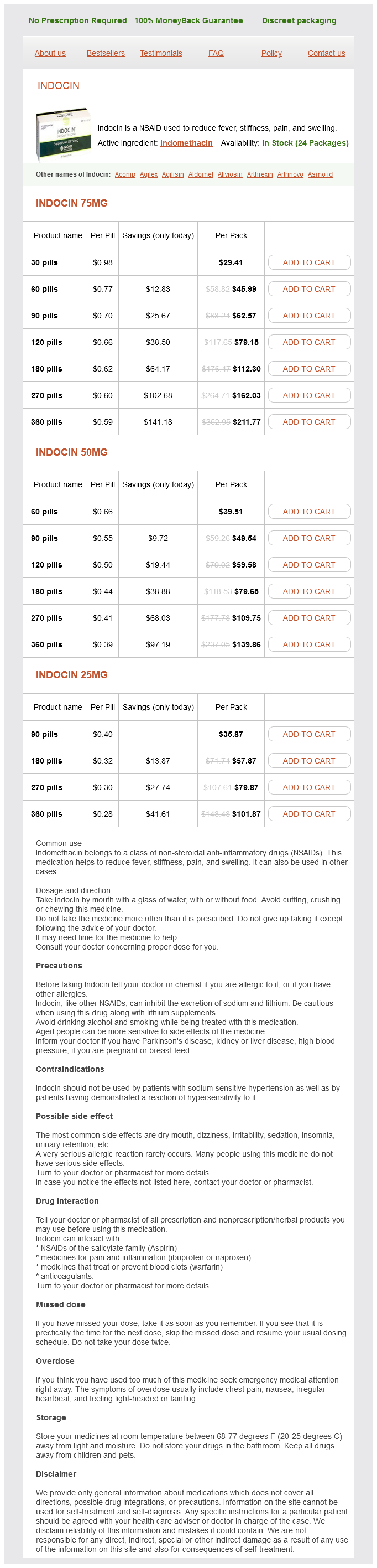 Indomethacin packs: 30 pills, 60 pills, 90 pills, 120 pills, 180 pills, 270 pills, 360 pills