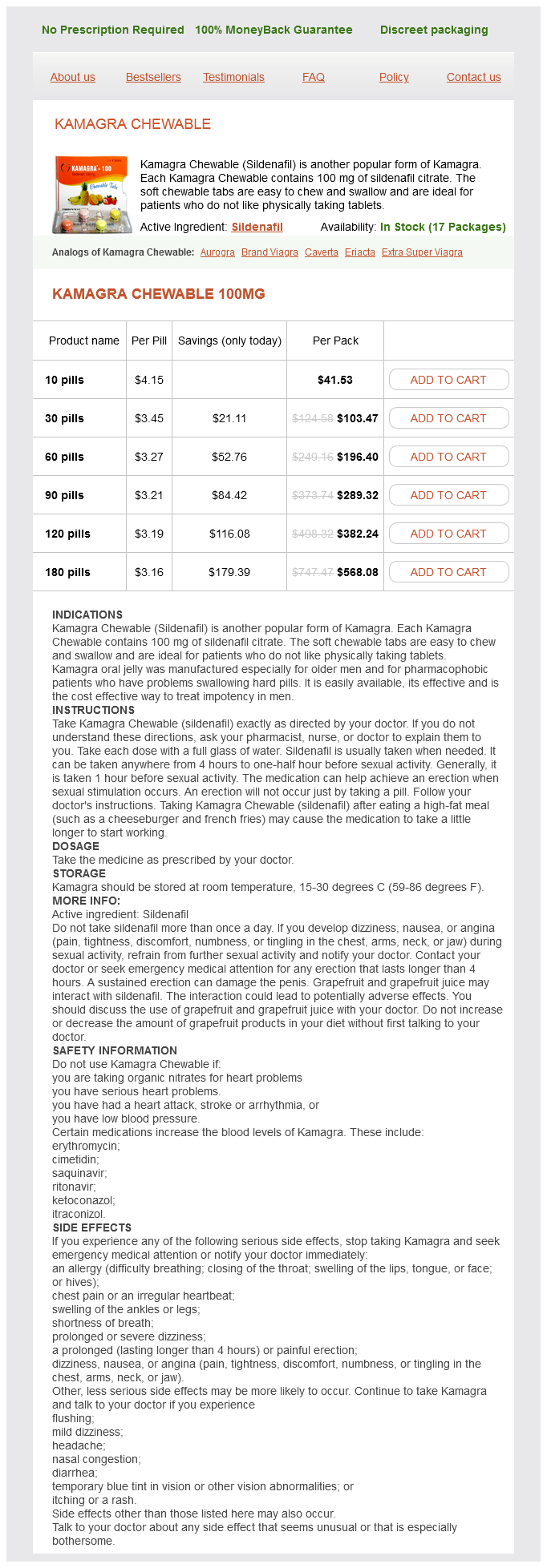 Kamagra Chewable packs: 10 pills, 30 pills, 60 pills, 90 pills, 120 pills, 180 pills