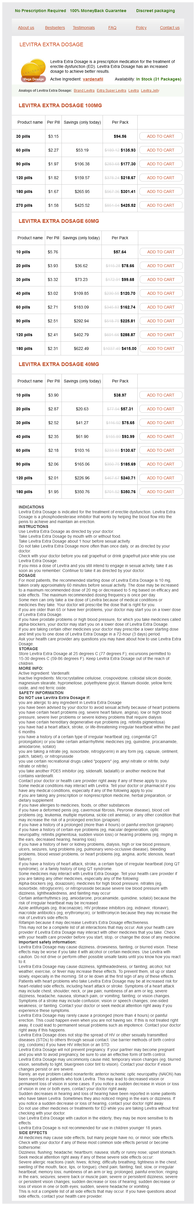 Levitra Extra Dosage packs: 30 pills, 60 pills, 90 pills, 120 pills, 180 pills, 270 pills, 10 pills, 20 pills, 40 pills