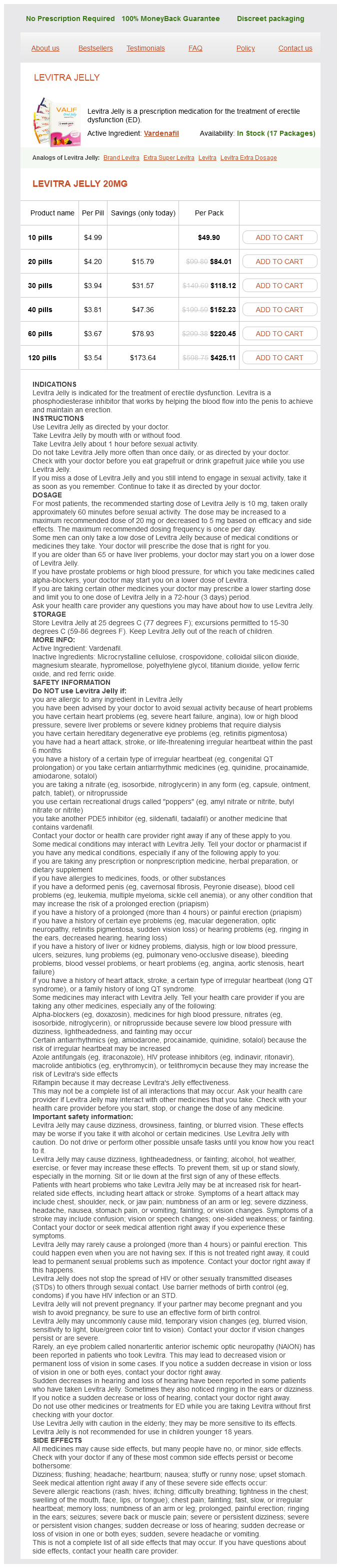 Levitra Jelly packs: 10 pills, 20 pills, 30 pills, 40 pills, 60 pills, 120 pills