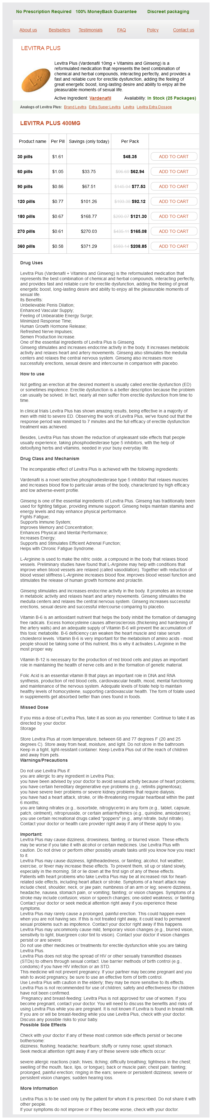 Levitra Plus packs: 30 pills, 60 pills, 90 pills, 120 pills, 180 pills, 270 pills, 360 pills
