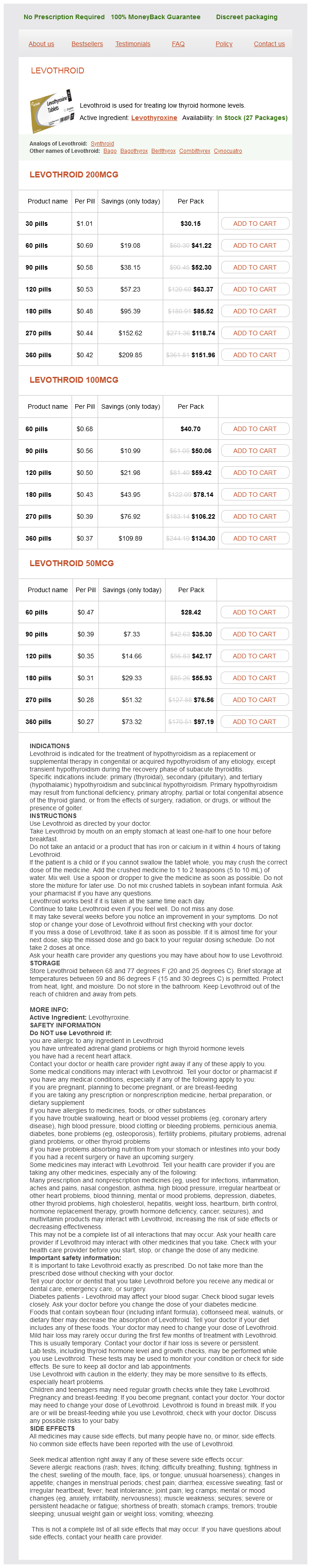 Levothroid packs: 30 pills, 60 pills, 90 pills, 120 pills, 180 pills, 270 pills, 360 pills