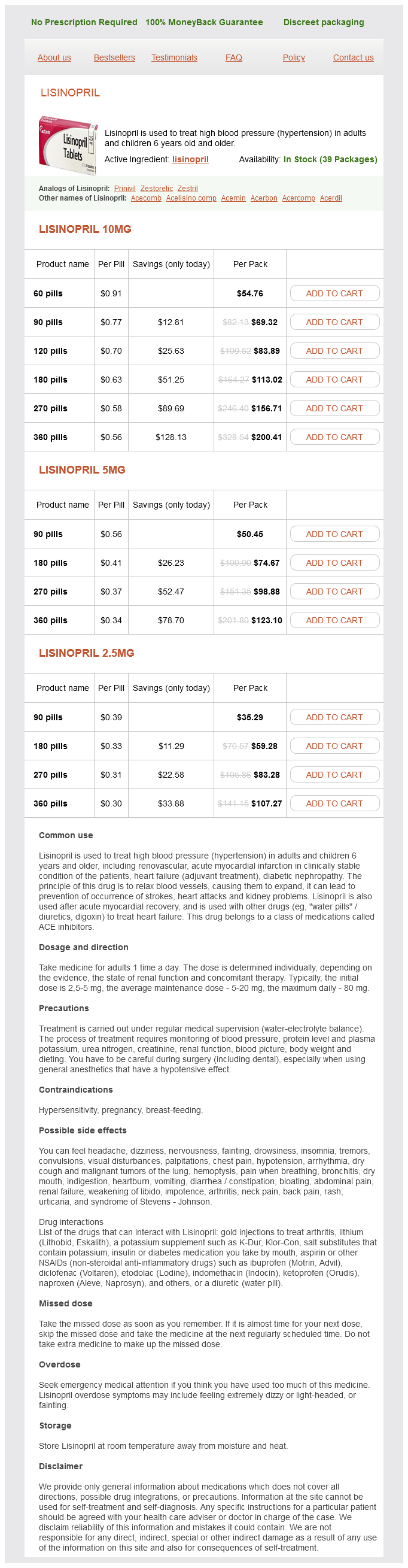 Lisinopril packs: 60 pills, 90 pills, 120 pills, 180 pills, 270 pills, 360 pills