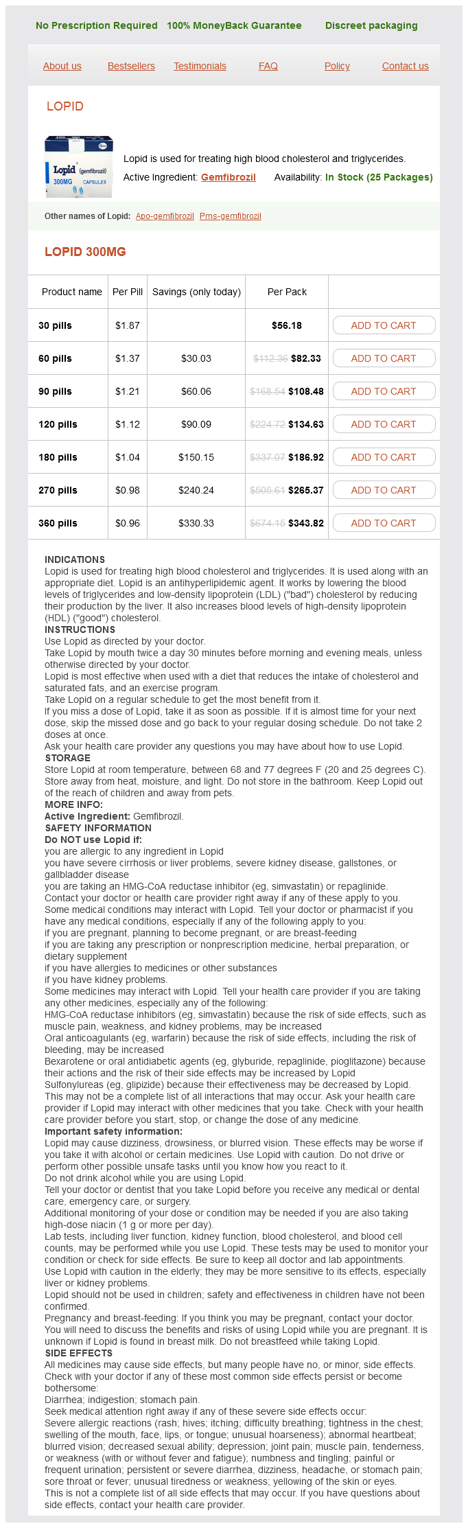 Lopid packs: 30 pills, 60 pills, 90 pills, 120 pills, 180 pills, 270 pills, 360 pills