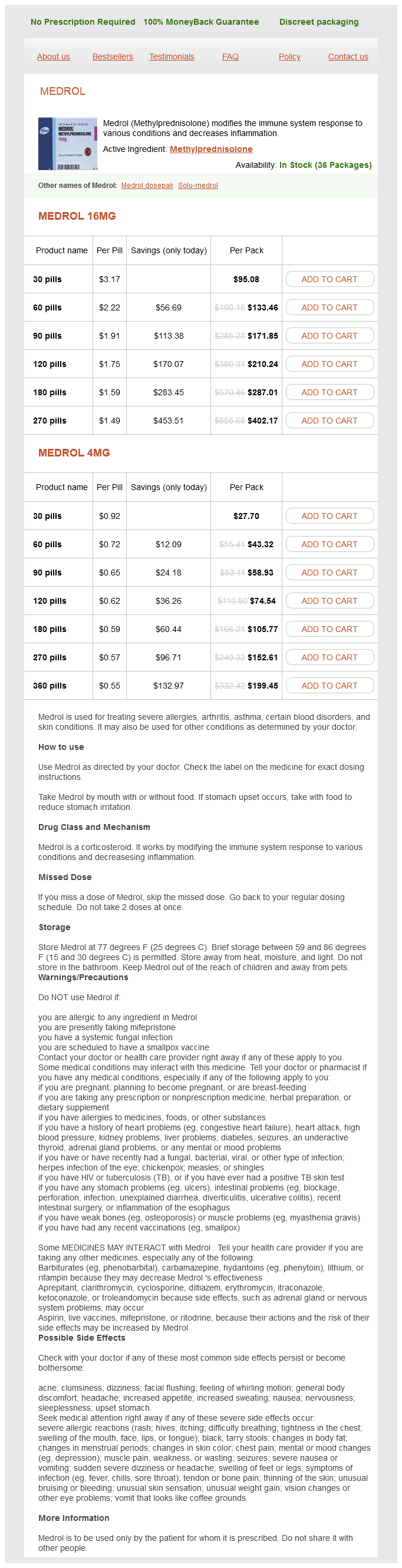 Medrol packs: 30 pills, 60 pills, 90 pills, 120 pills, 180 pills, 270 pills, 360 pills