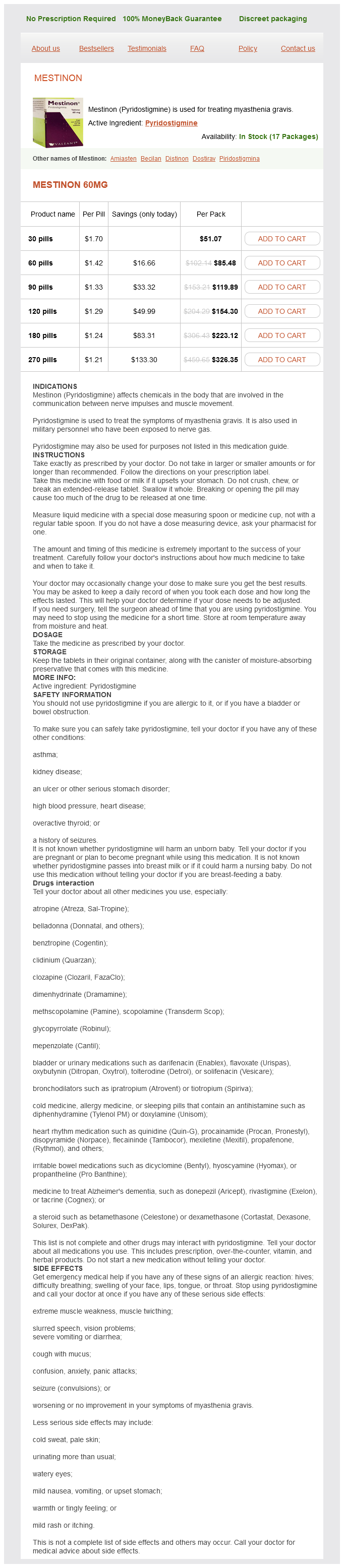 Mestinon packs: 30 pills, 60 pills, 90 pills, 120 pills, 180 pills, 270 pills
