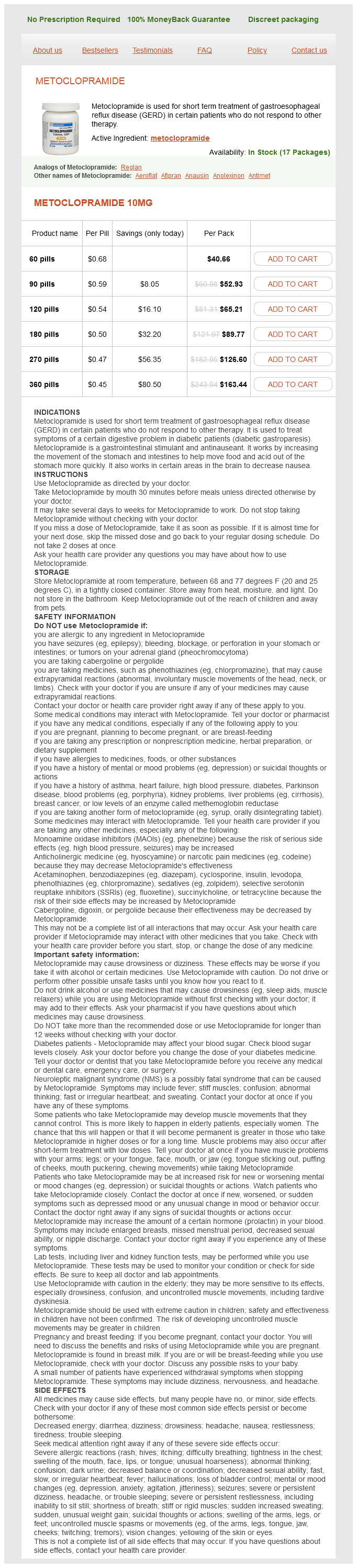 Metoclopramide packs: 60 pills, 90 pills, 120 pills, 180 pills, 270 pills, 360 pills