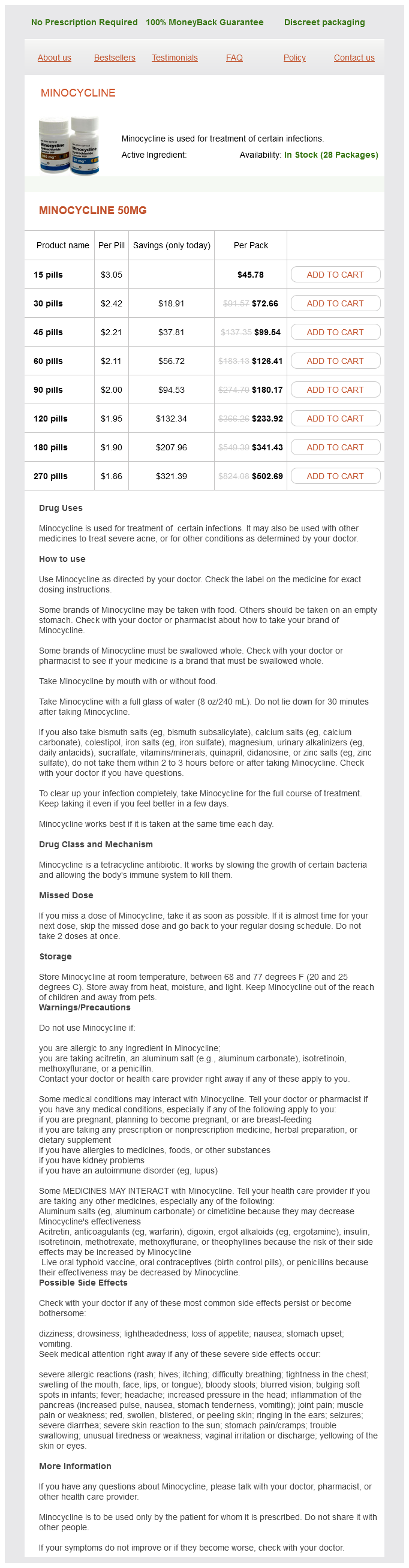 Minocycline packs: 15 pills, 30 pills, 45 pills, 60 pills, 90 pills, 120 pills, 180 pills, 270 pills