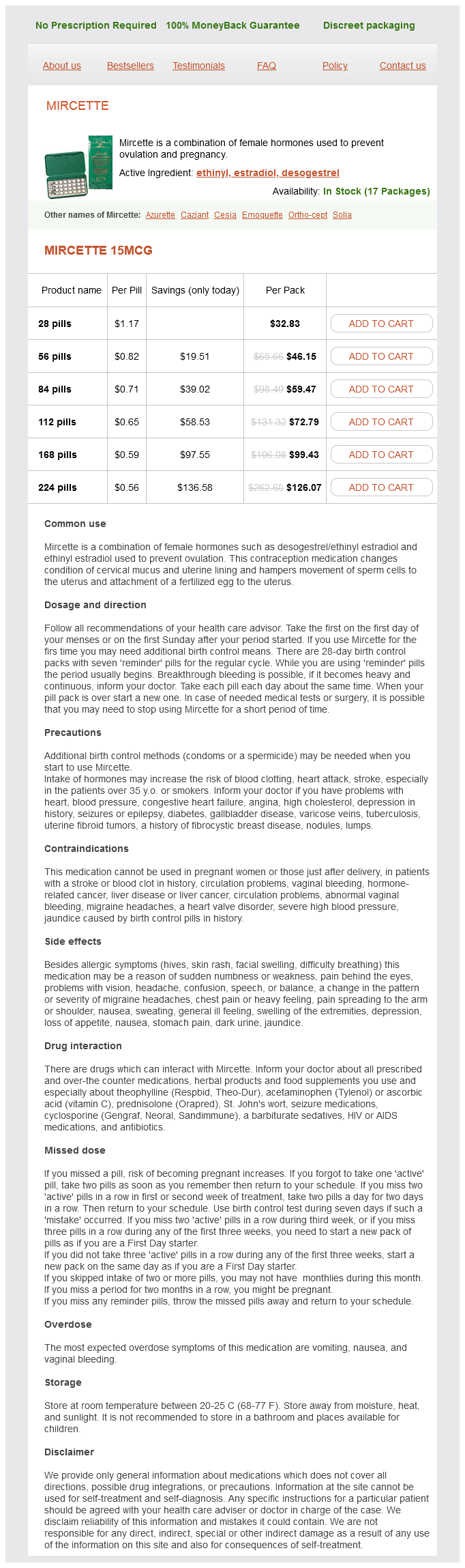 Mircette packs: 28 pills, 56 pills, 84 pills, 112 pills, 168 pills, 224 pills