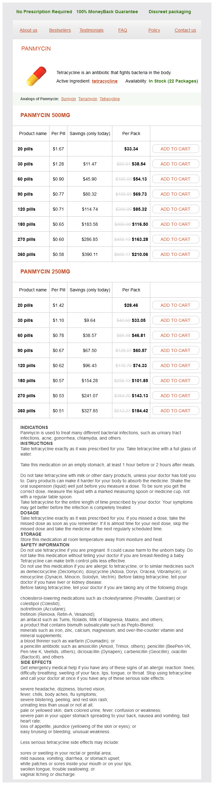 Panmycin packs: 20 pills, 30 pills, 60 pills, 90 pills, 120 pills, 180 pills, 270 pills, 360 pills