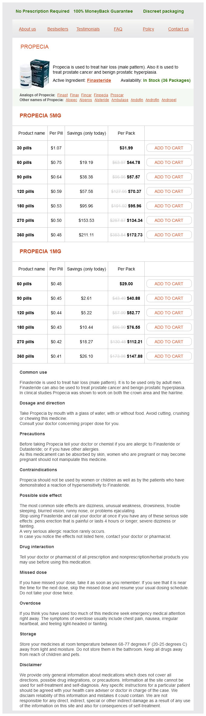Propecia packs: 30 pills, 60 pills, 90 pills, 120 pills, 180 pills, 270 pills, 360 pills