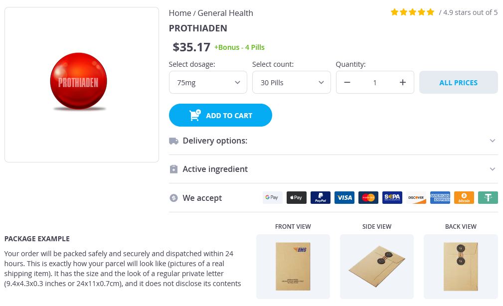 Prothiaden packs: 30 pills, 60 pills, 90 pills, 120 pills, 180 pills