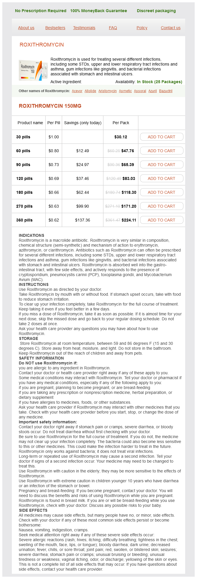 Roxithromycin packs: 30 pills, 60 pills, 90 pills, 120 pills, 180 pills, 270 pills, 360 pills