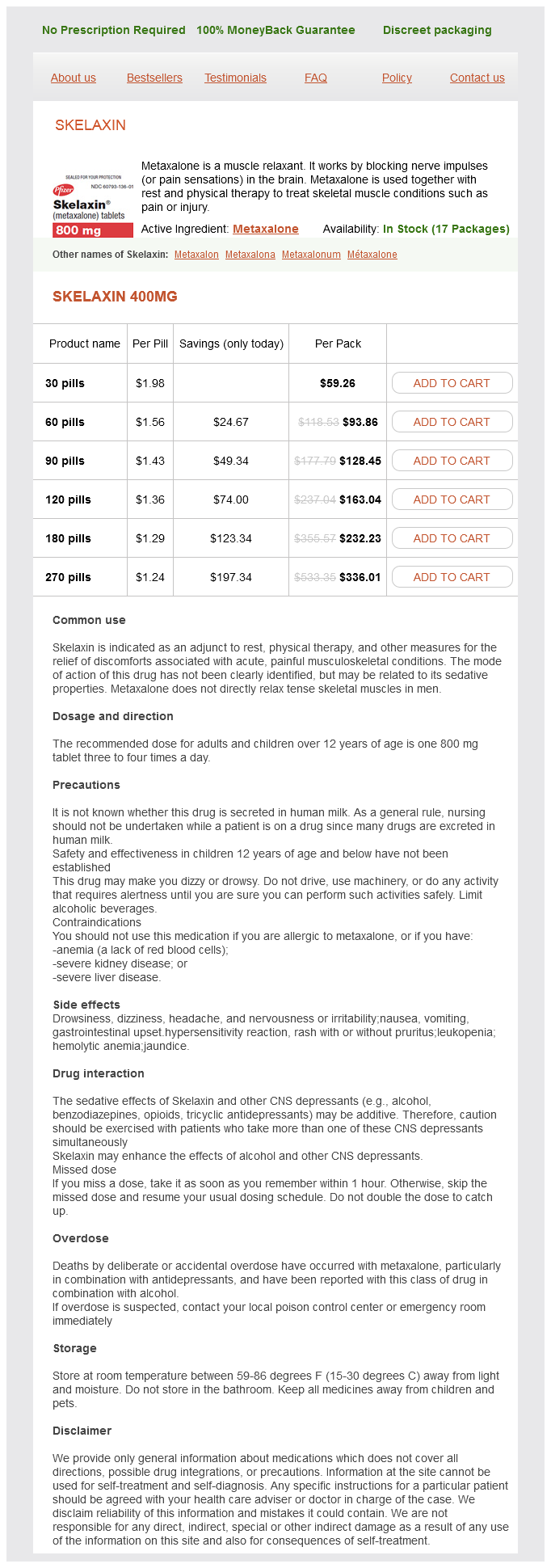 Skelaxin packs: 30 pills, 60 pills, 90 pills, 120 pills, 180 pills, 270 pills
