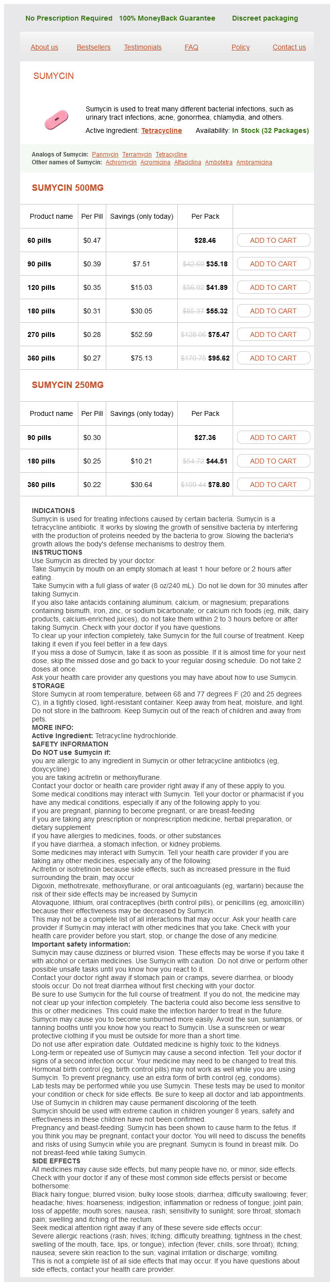 Sumycin packs: 60 pills, 90 pills, 120 pills, 180 pills, 270 pills, 360 pills