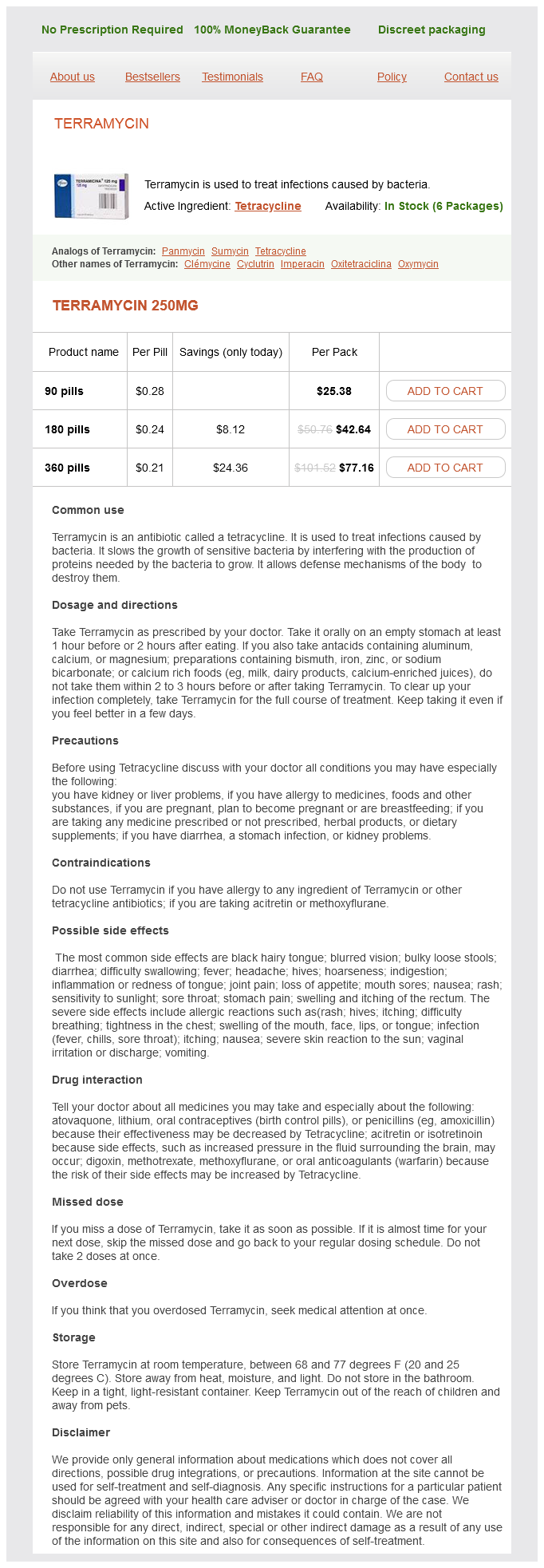 Terramycin packs: 90 pills, 180 pills, 360 pills