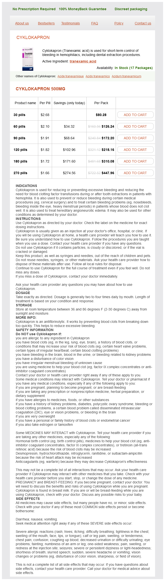 Tranexamic Acid packs: 30 pills, 60 pills, 90 pills, 120 pills, 180 pills, 270 pills