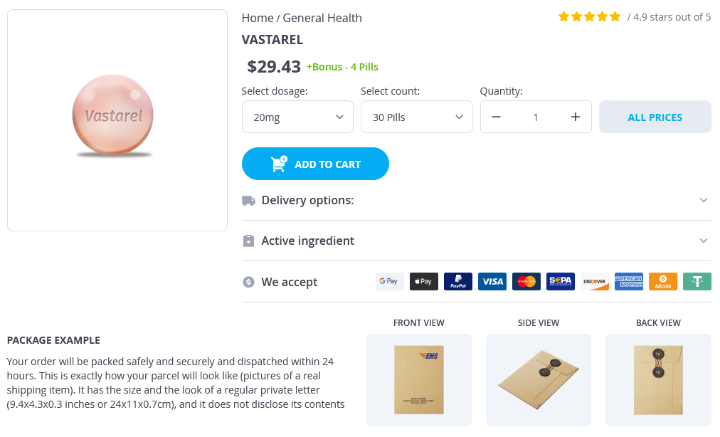 Vastarel packs: 30 pills, 60 pills, 90 pills, 120 pills
