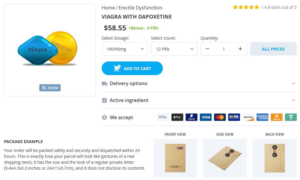 Viagra with Dapoxetine packs: 12 pills, 20 pills, 30 pills, 32 pills, 60 pills, 90 pills, 120 pills, 180 pills, 240 pills, 270 pills, 300 pills, 360 pills
