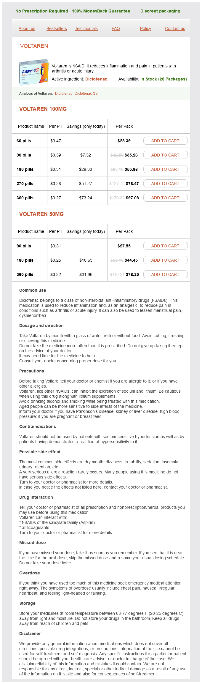 Voltaren packs: 60 pills, 90 pills, 180 pills, 270 pills, 360 pills